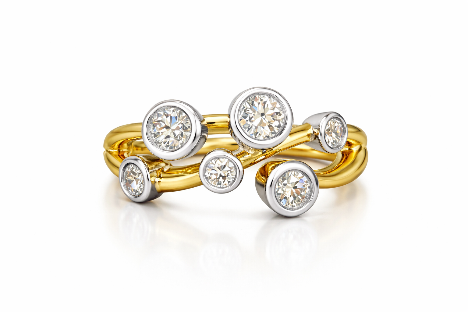 A contemporary bubble-style ring crafted in rich 18K yellow gold, finished with platinum bezel settings. Round brilliant diamonds are scattered across the band in softly varying sizes, creating an organic, balanced design with natural movement and light.