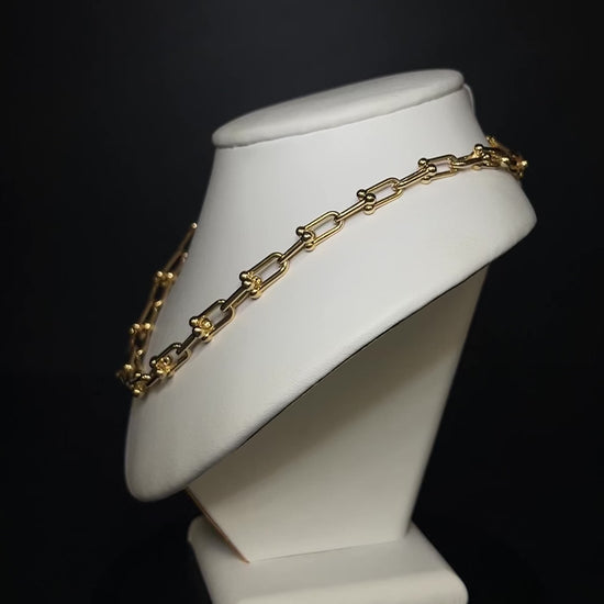 Crafted in 9K yellow Gold, this paperclip style chain necklace features elongated links with polished bead detailing, creating a contemporary design with subtle texture and movement.