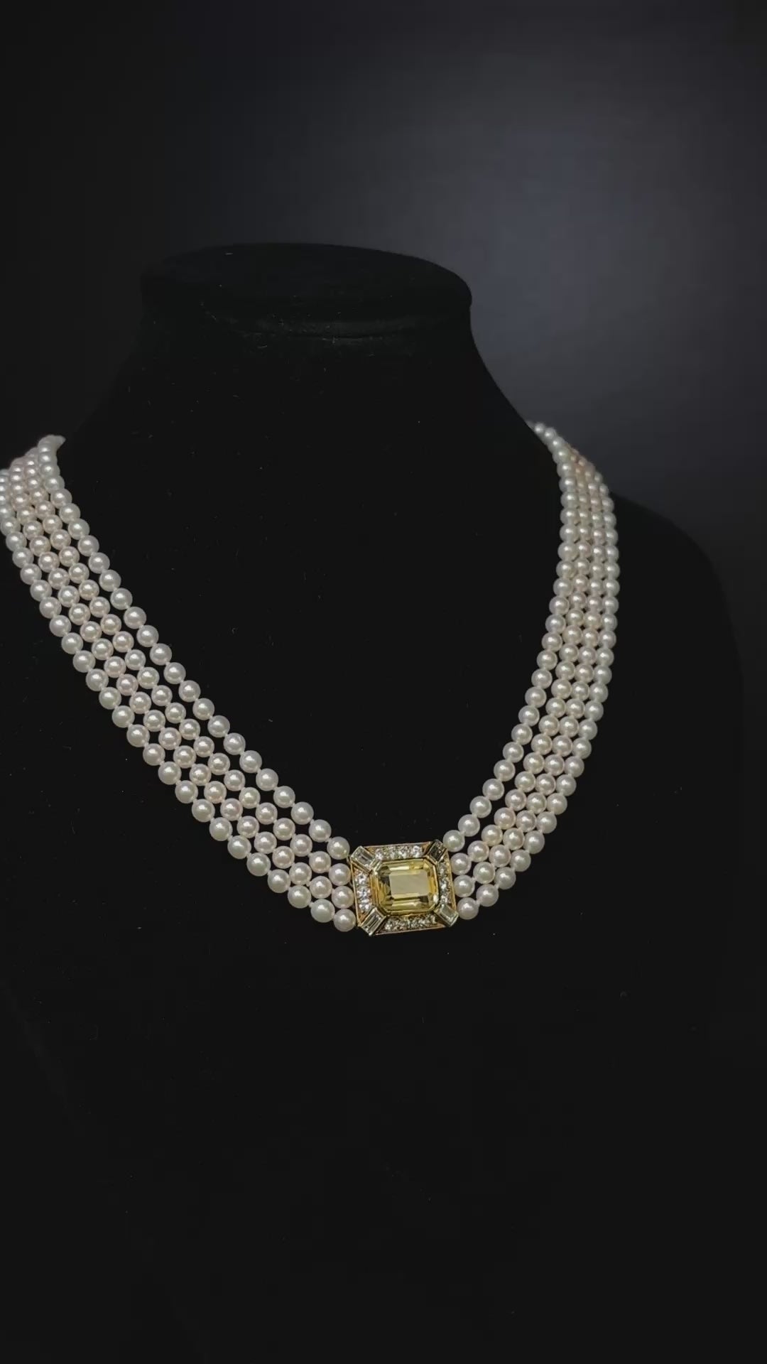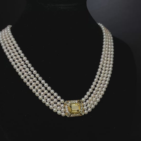 A striking four-row cultured pearl necklace with an 18K yellow gold citrine and diamond clasp, paired with matching citrine and diamond earrings in 18K yellow gold.