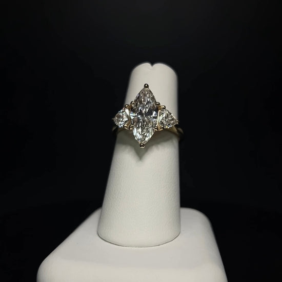 9K yellow gold set with a 2.5ct lab-grown marquise centre diamond, paired with two 0.50ct trillion-cut accent diamonds.